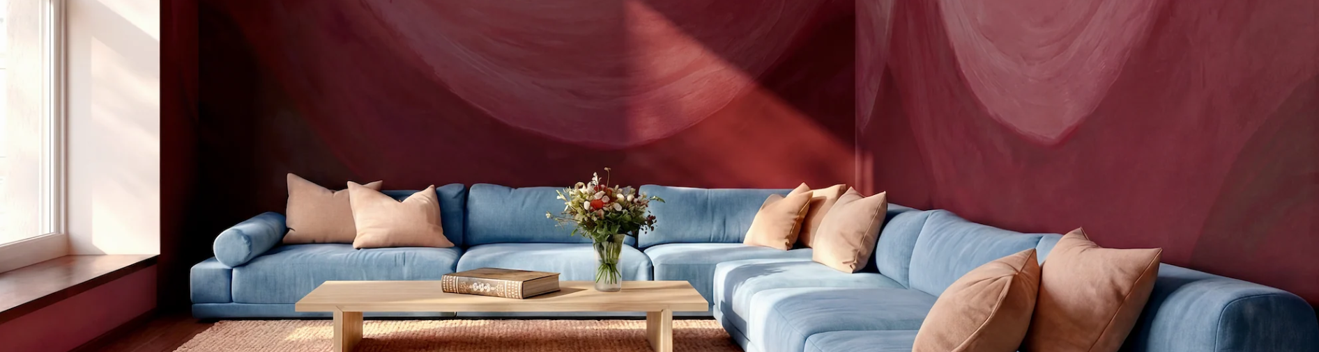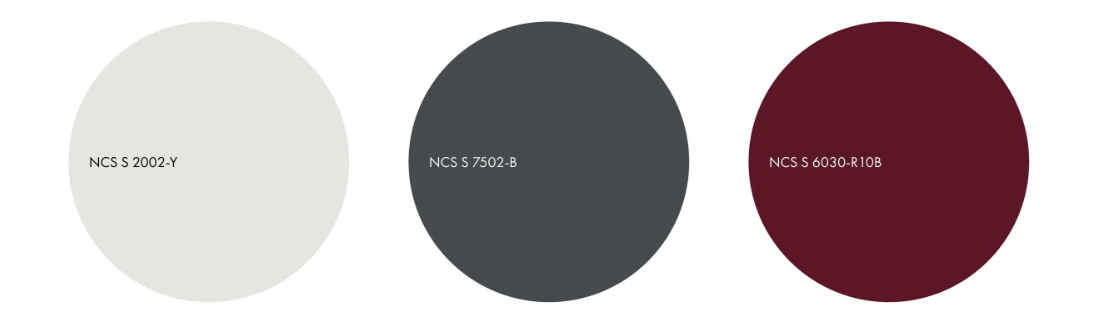 Mørk skygge: Denne kombinasjonen er sentrert rundt S 4050-R, en dyp, dempet rødfarge som skaper en dramatisk, men kontrollert bakgrunn. Den dempede kromaen hindrer den i å overta rommet, noe som gjør den ideell for å skape intimitet.
